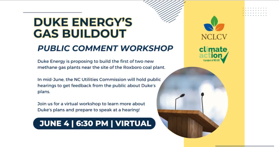 Duke Energy is proposing to build the first of two new methane gas plants near the site of the Roxboro coal plant. In mid-June, the NC Utilities Commission will hold public hearings to get feedback from the public about Duke’s plans. Join the NC League of Conservation Voters for a virtual workshop to learn more about Duke’s plans and prepare to speak at one of the upcoming hearings!